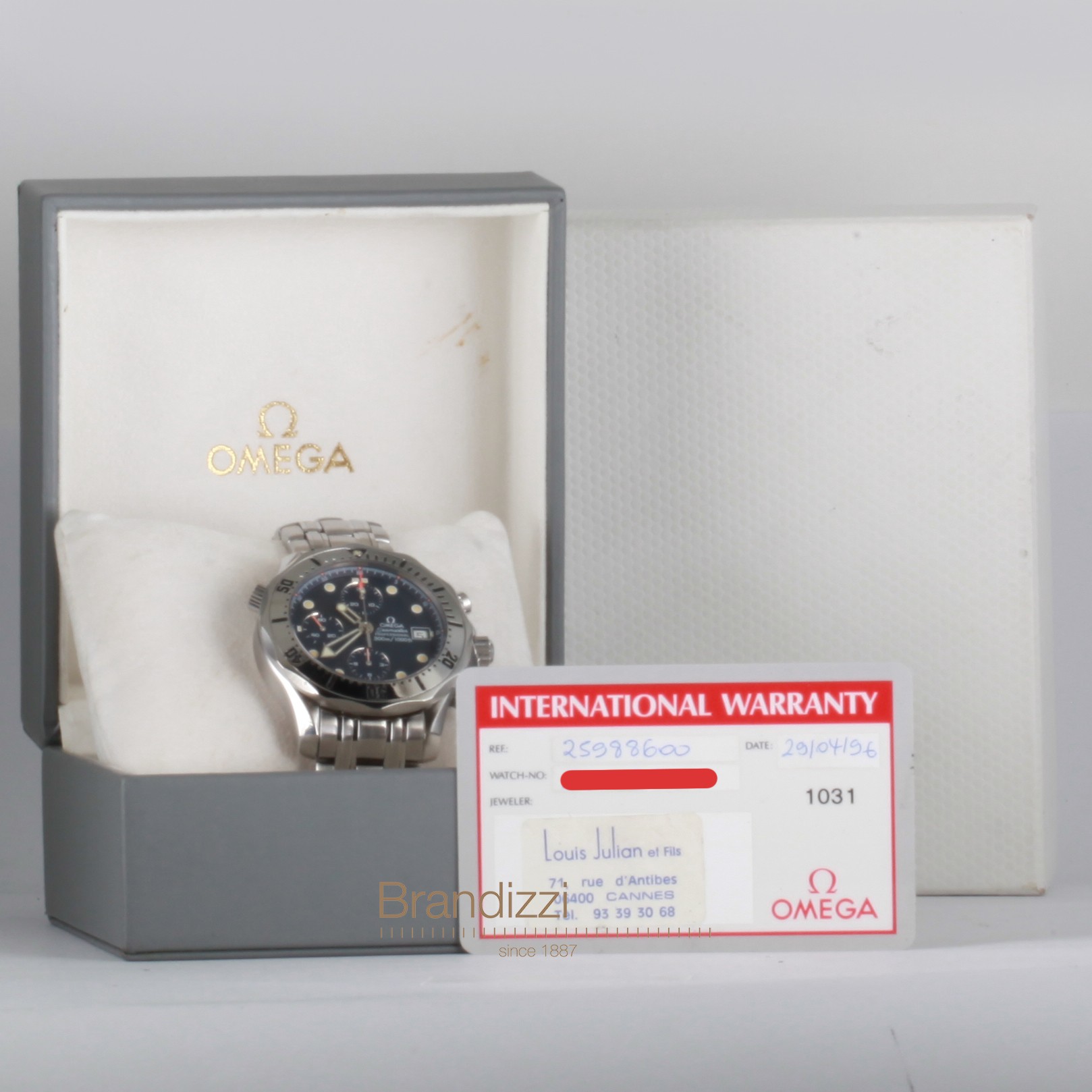 ステンレスオート直径 42 mm年式 1996包装箱と保証 OmegaBrandizzi保証 12 ヶ月